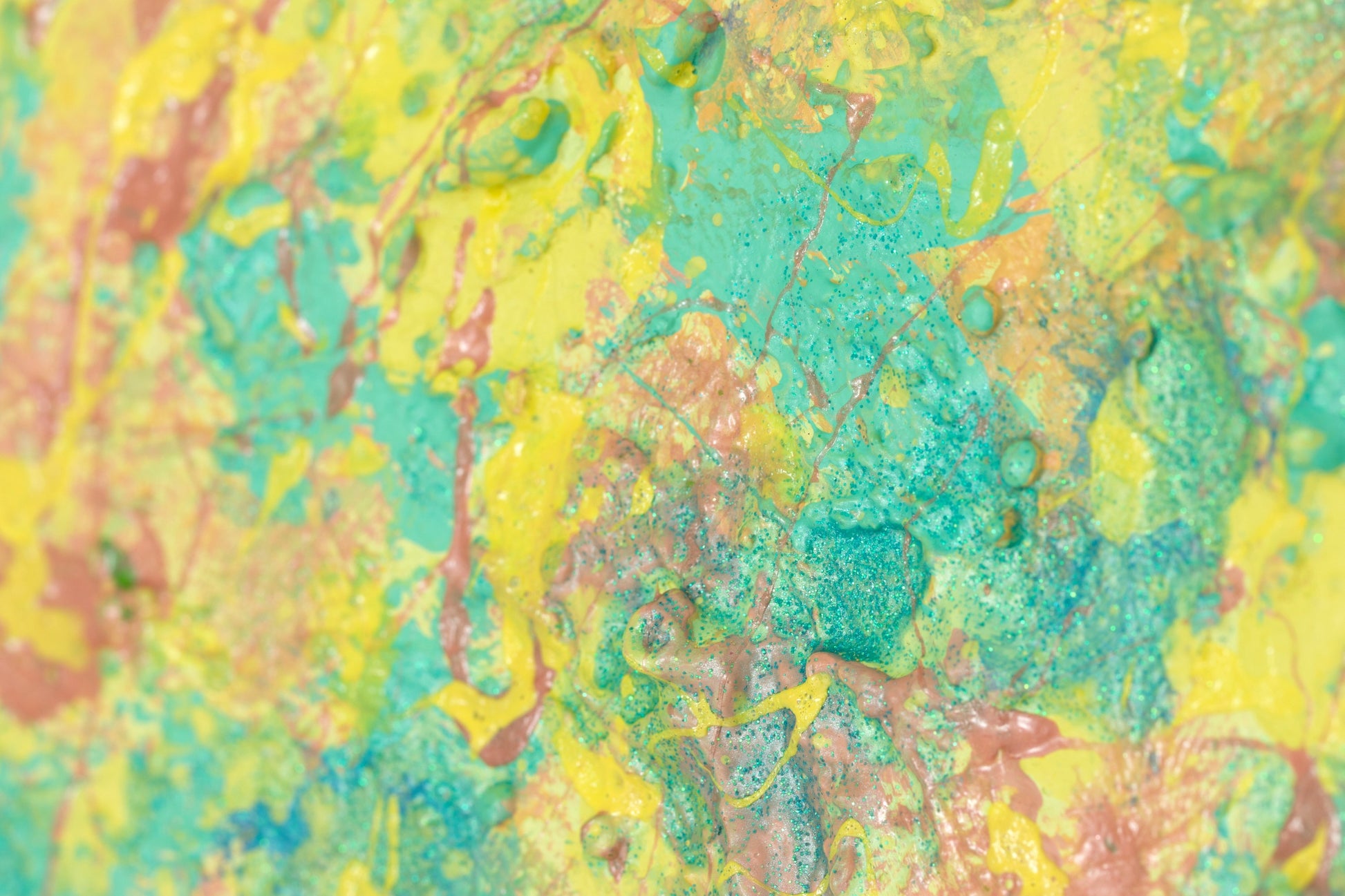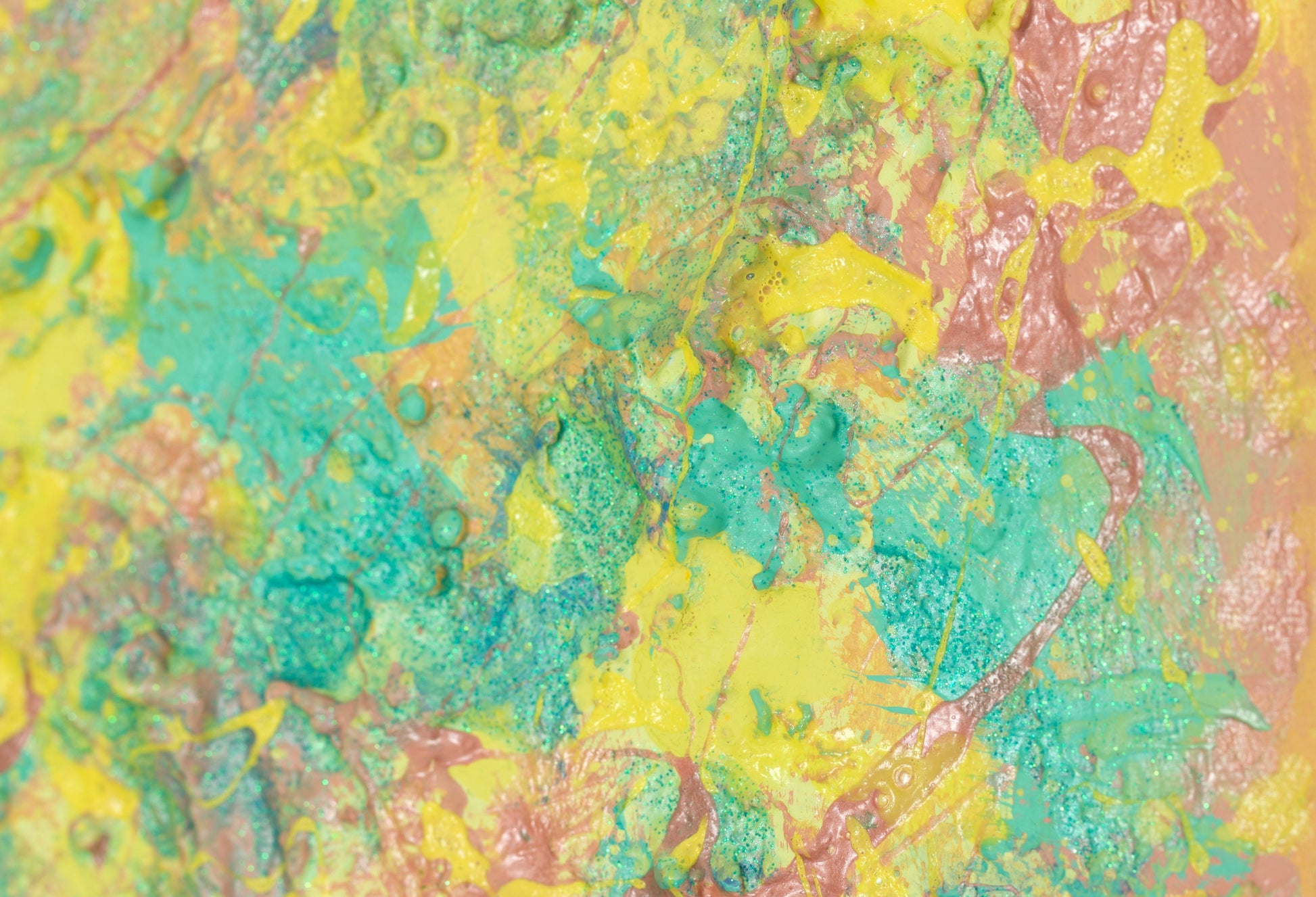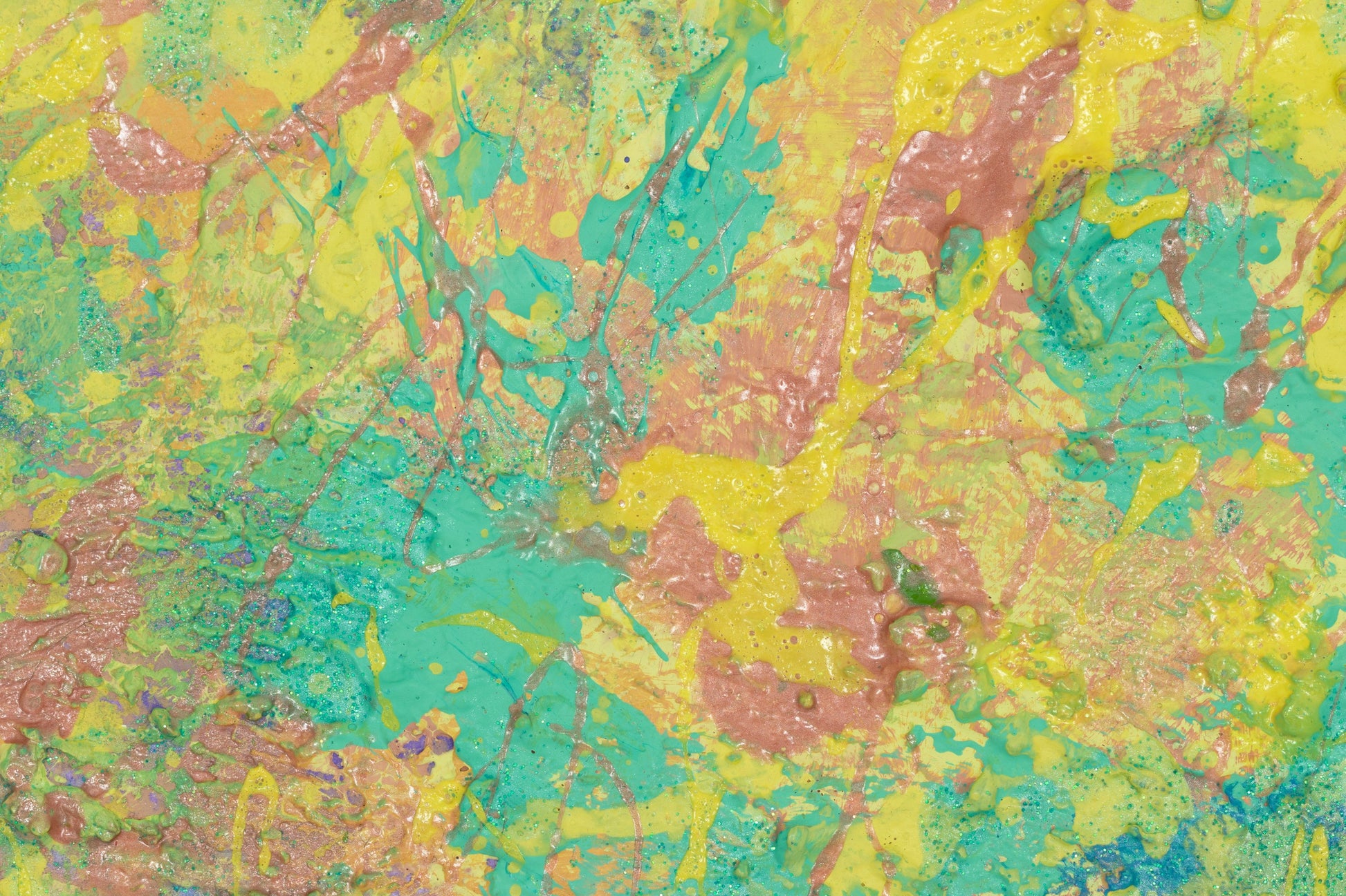 This is the original acrylic and objects painting on canvas that showcases a sculptural use of paint. The style creates a 3-D effect through a built-up mixture of thick gesso, paint, sand, and other materials.