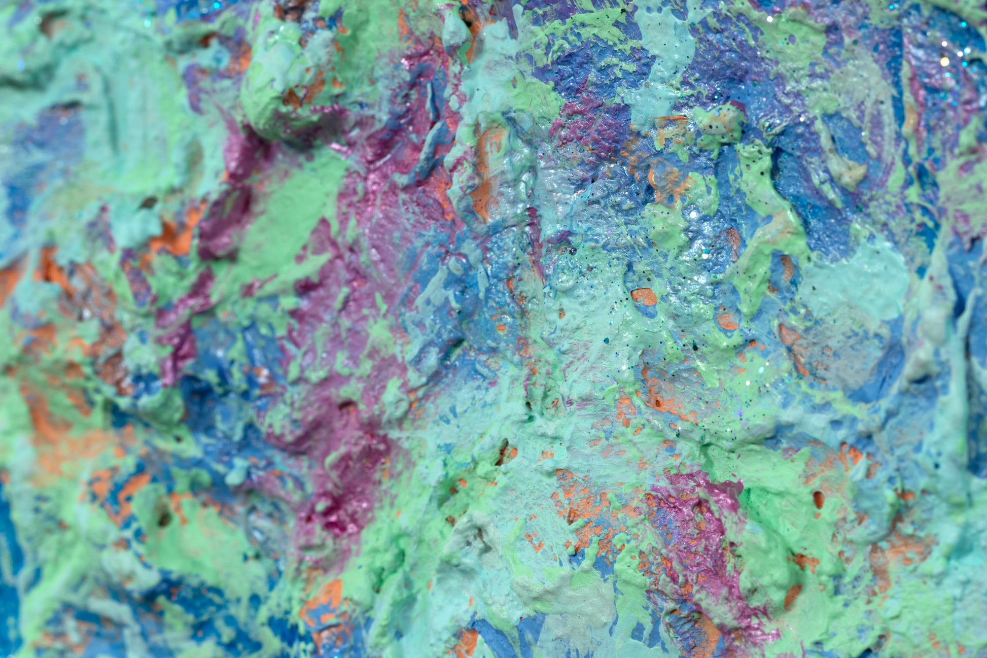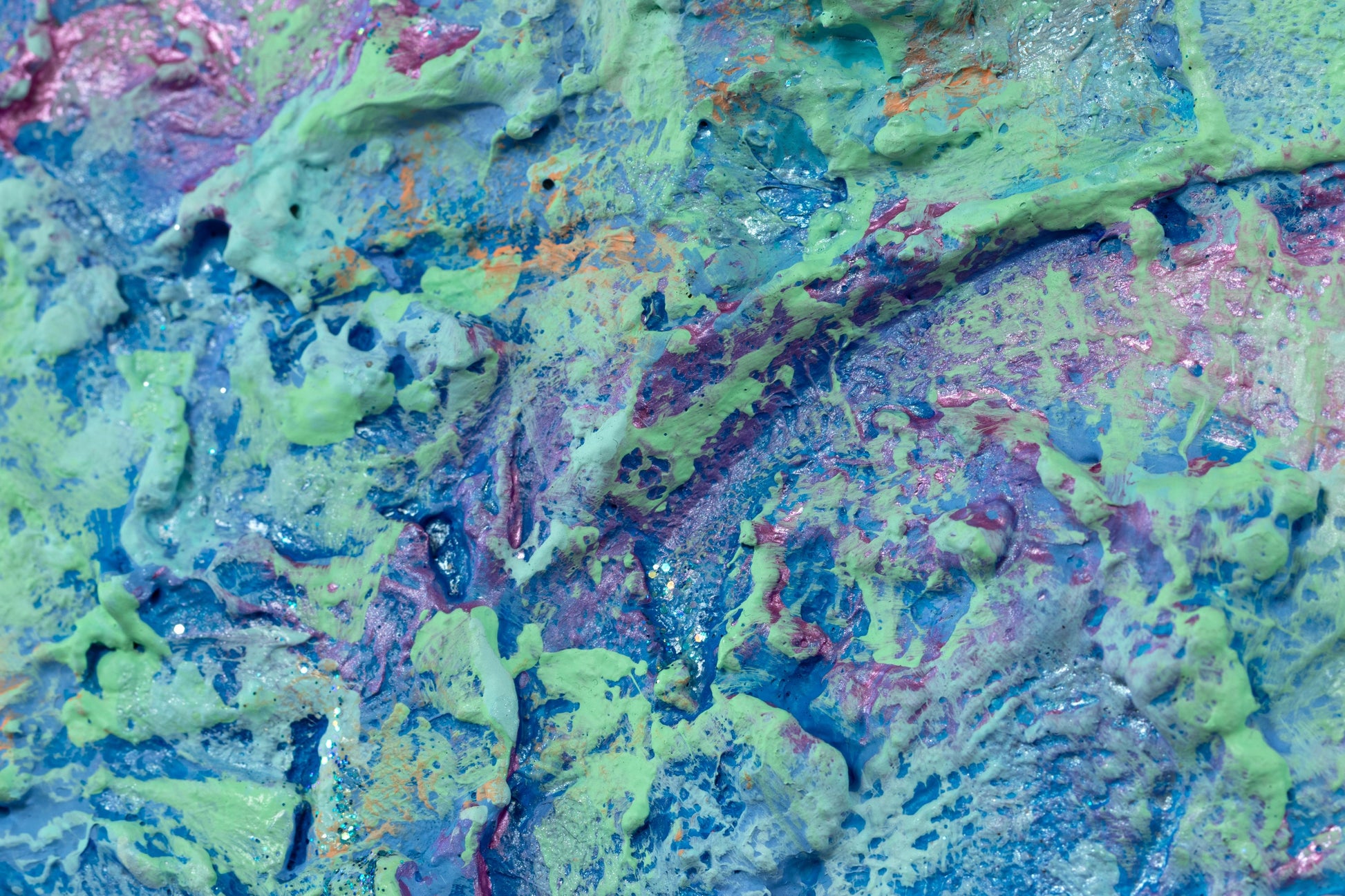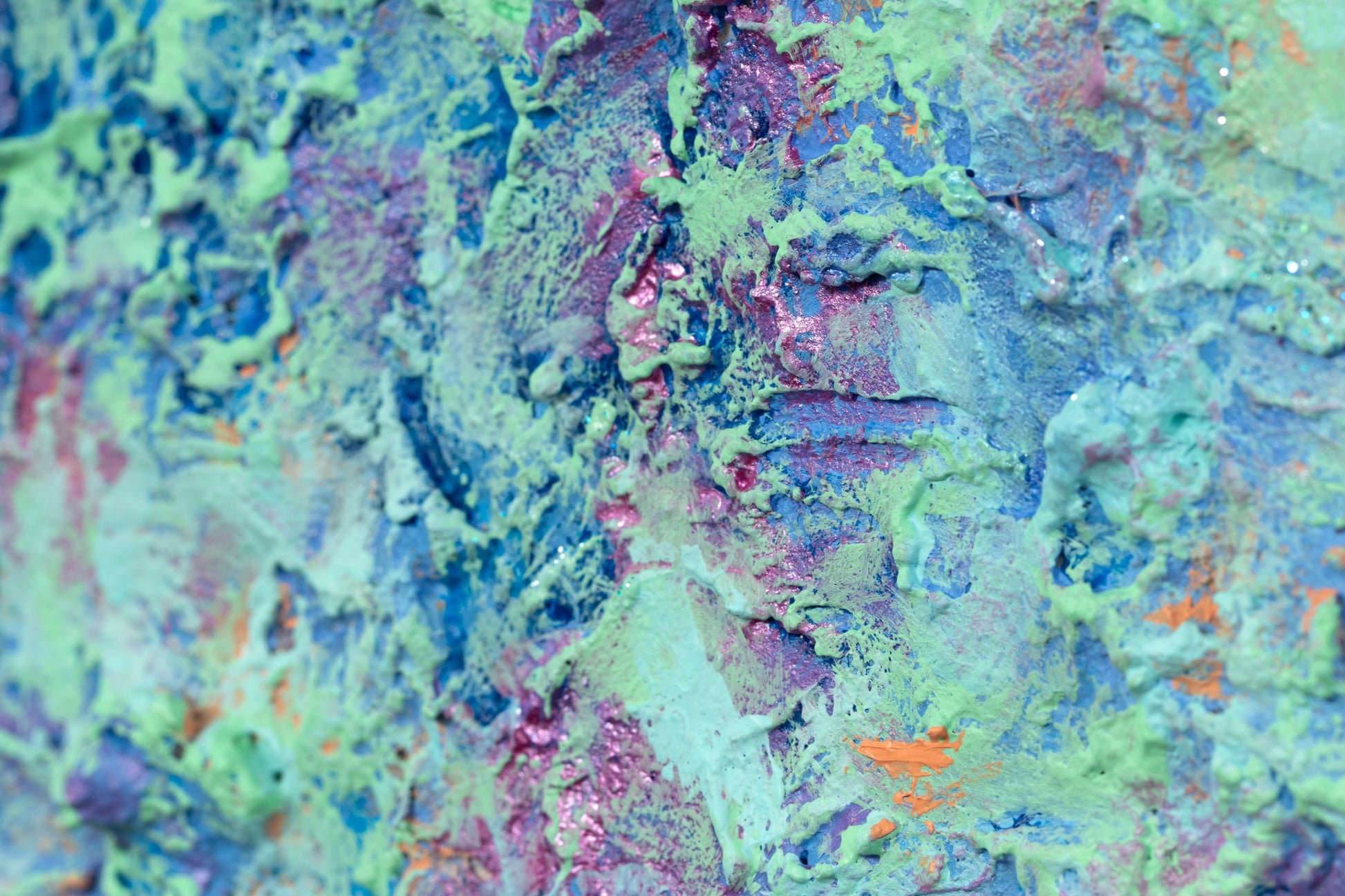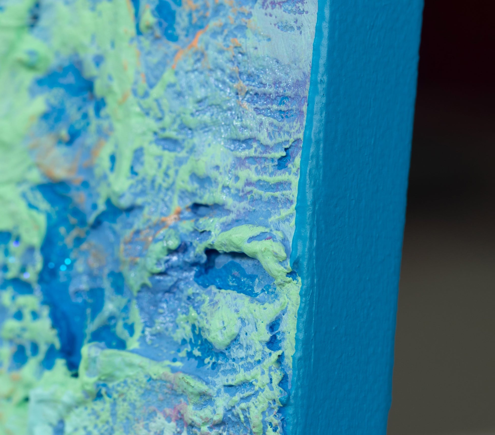 This is the original acrylic and objects painting on canvas that showcases a sculptural use of paint. The style creates a 3-D effect through a built-up mixture of thick gesso, paint, sand, and other materials.