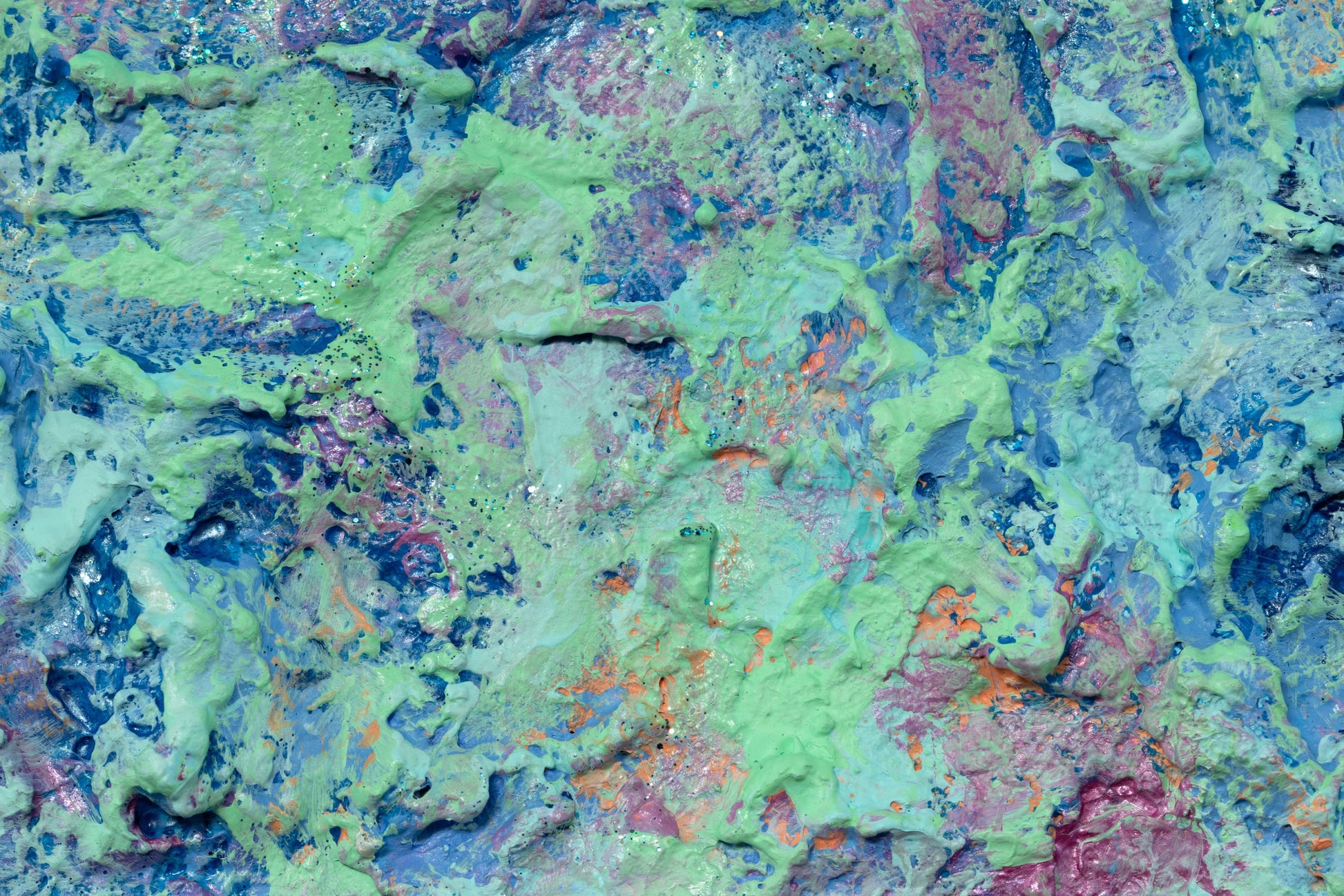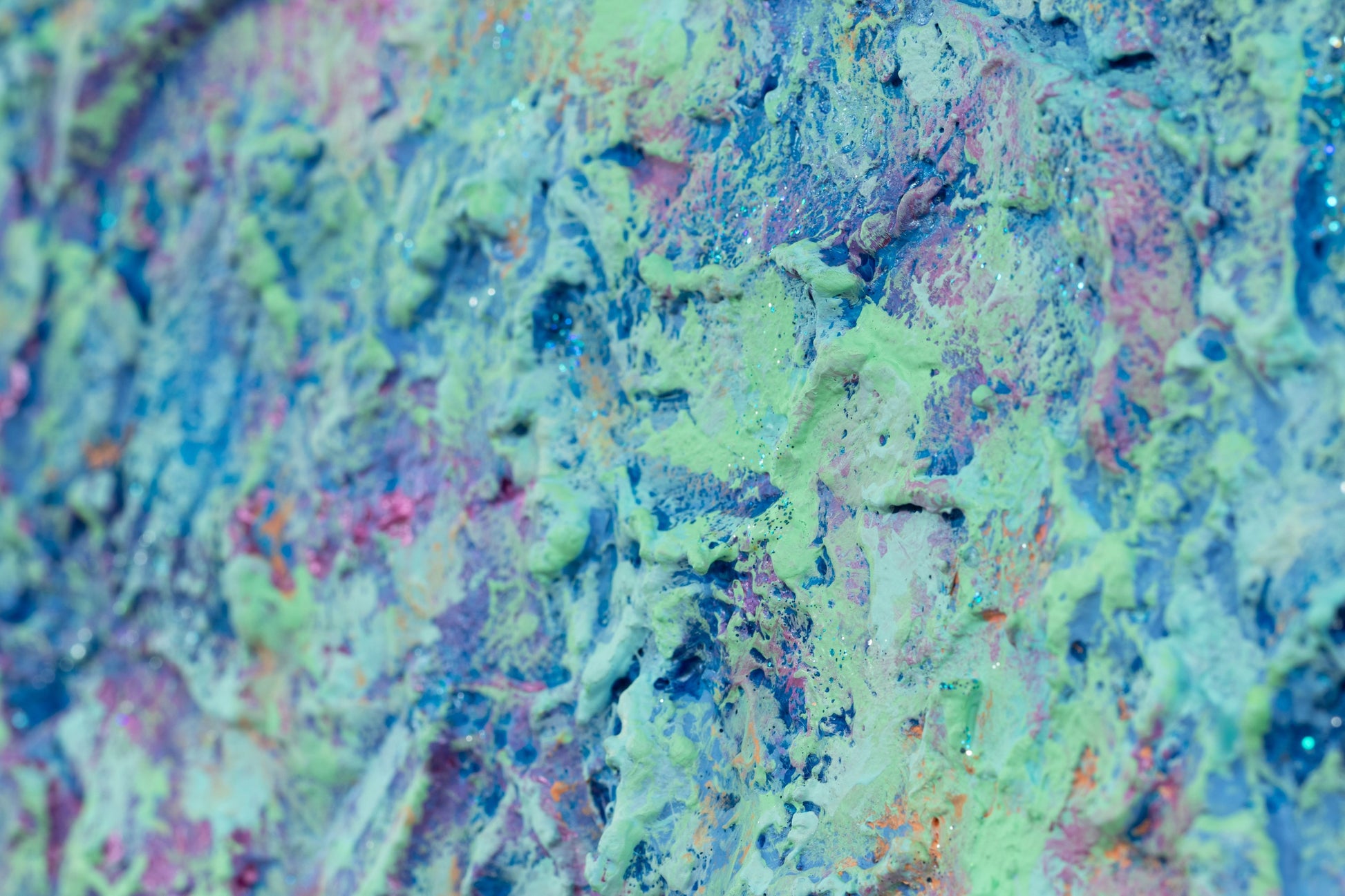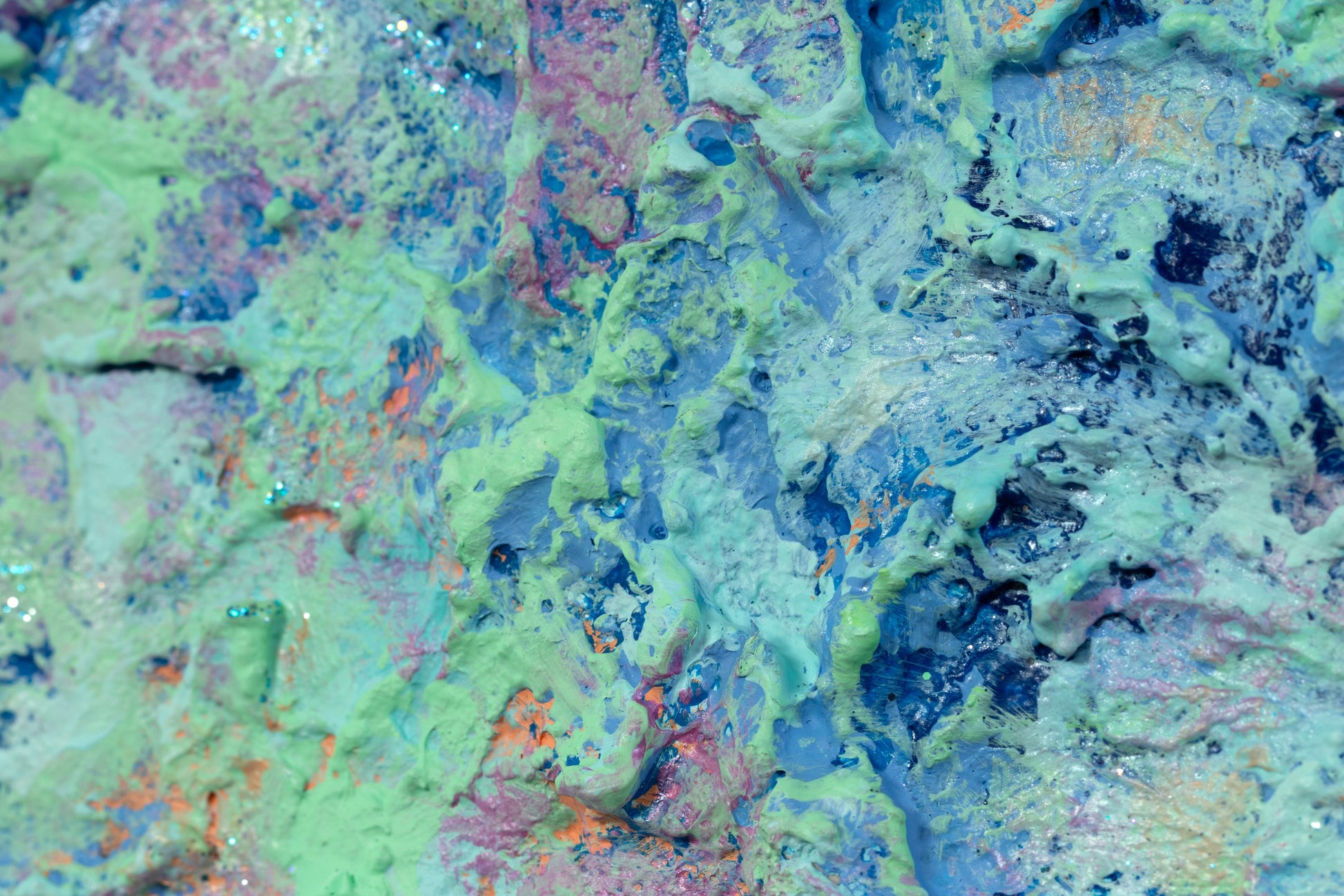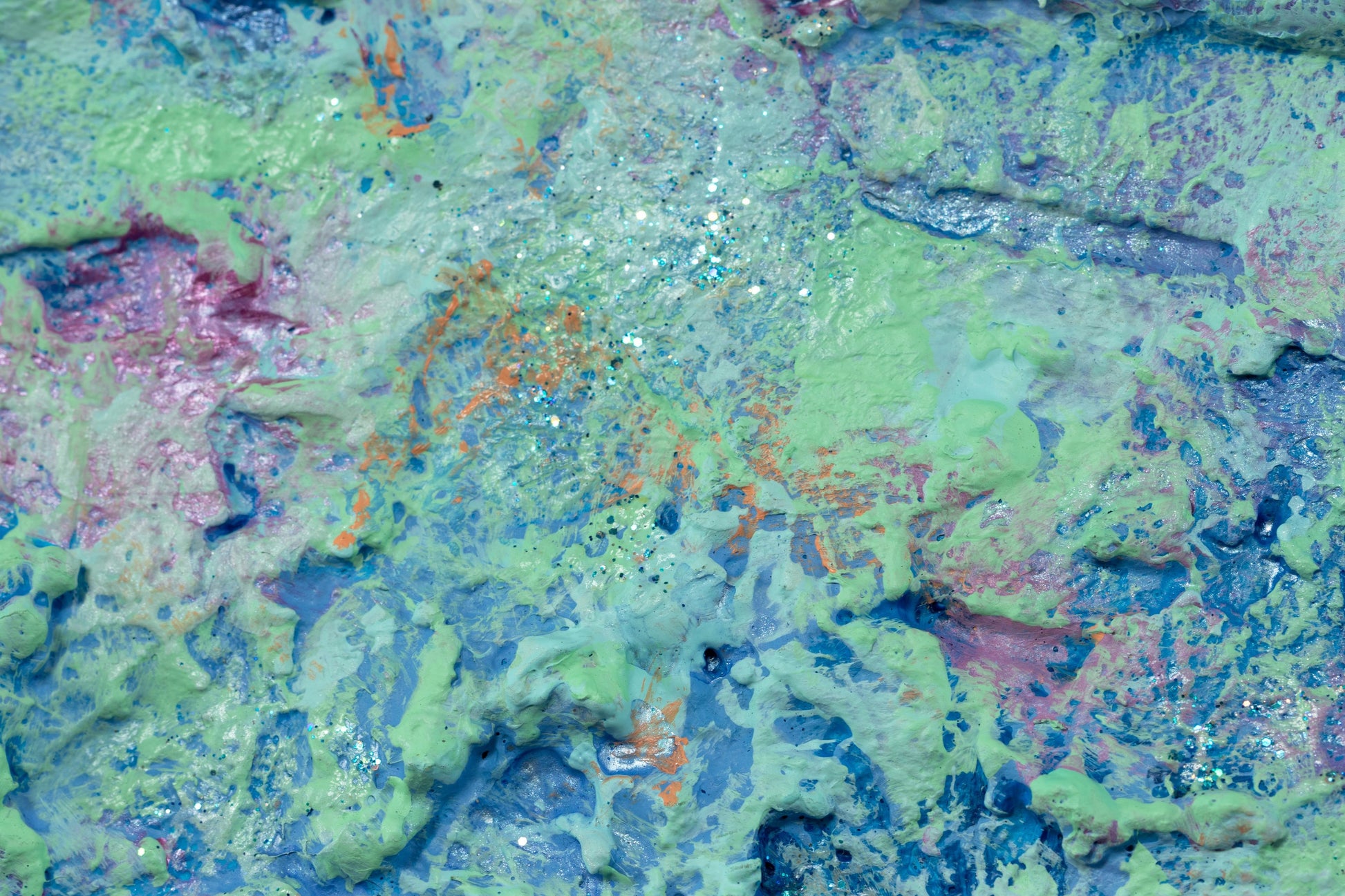 This is the original acrylic and objects painting on canvas that showcases a sculptural use of paint. The style creates a 3-D effect through a built-up mixture of thick gesso, paint, sand, and other materials.