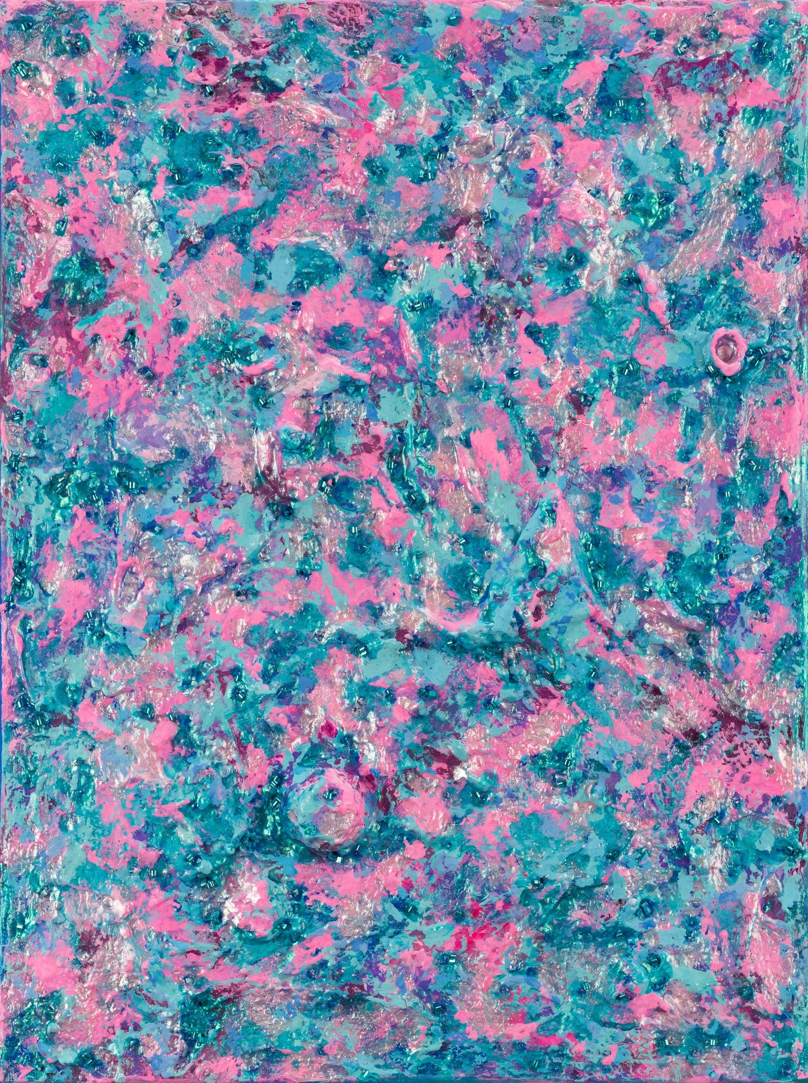 These are four paintings, sold together in a tetraptych series titled 'Labyrinth of Colors'. This is the acrylic and objects painting on canvas. The style is defined by sculptural use of paint. It is 3-D, built-up mixture of many layers of thick gesso, paint, sand and other materials.