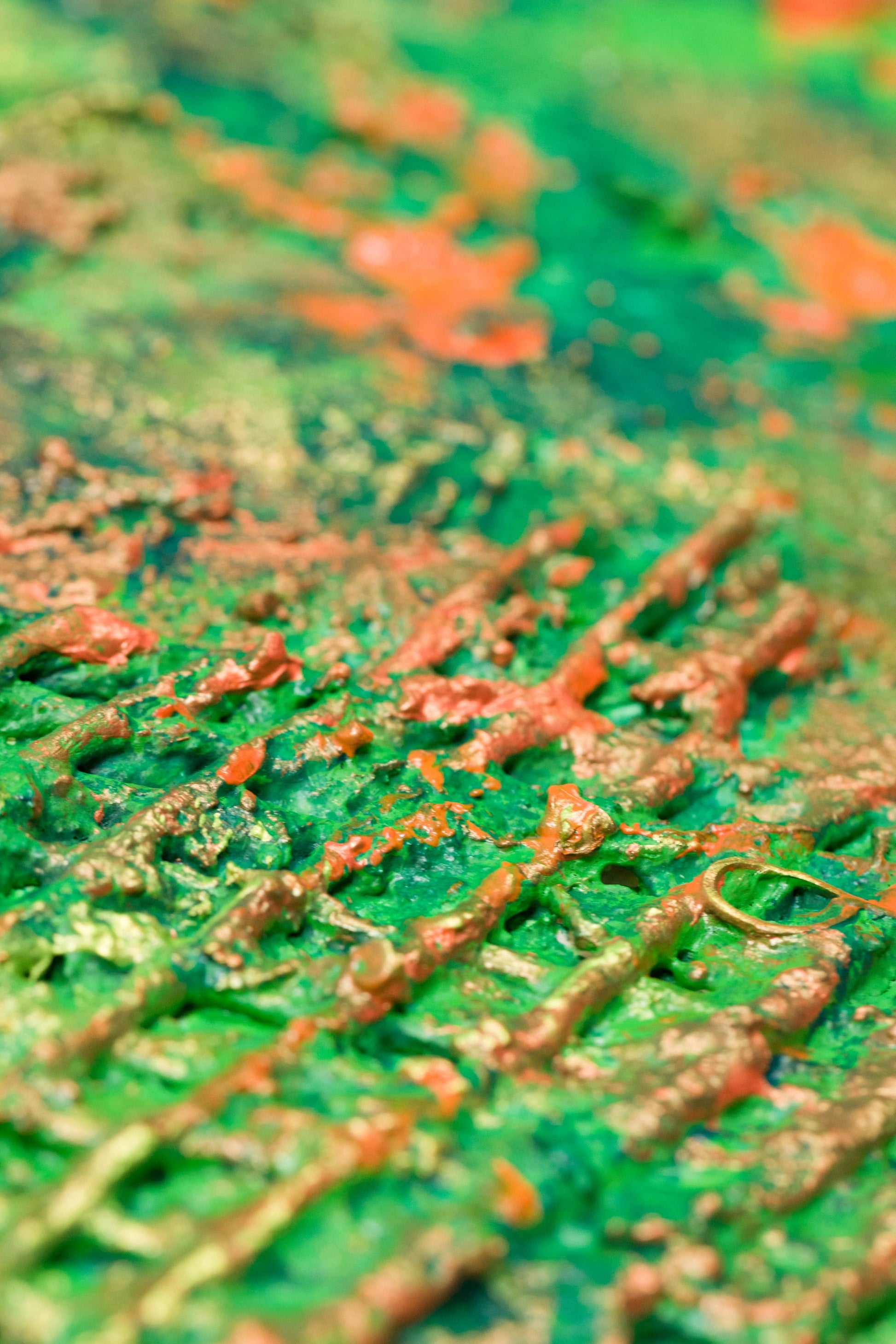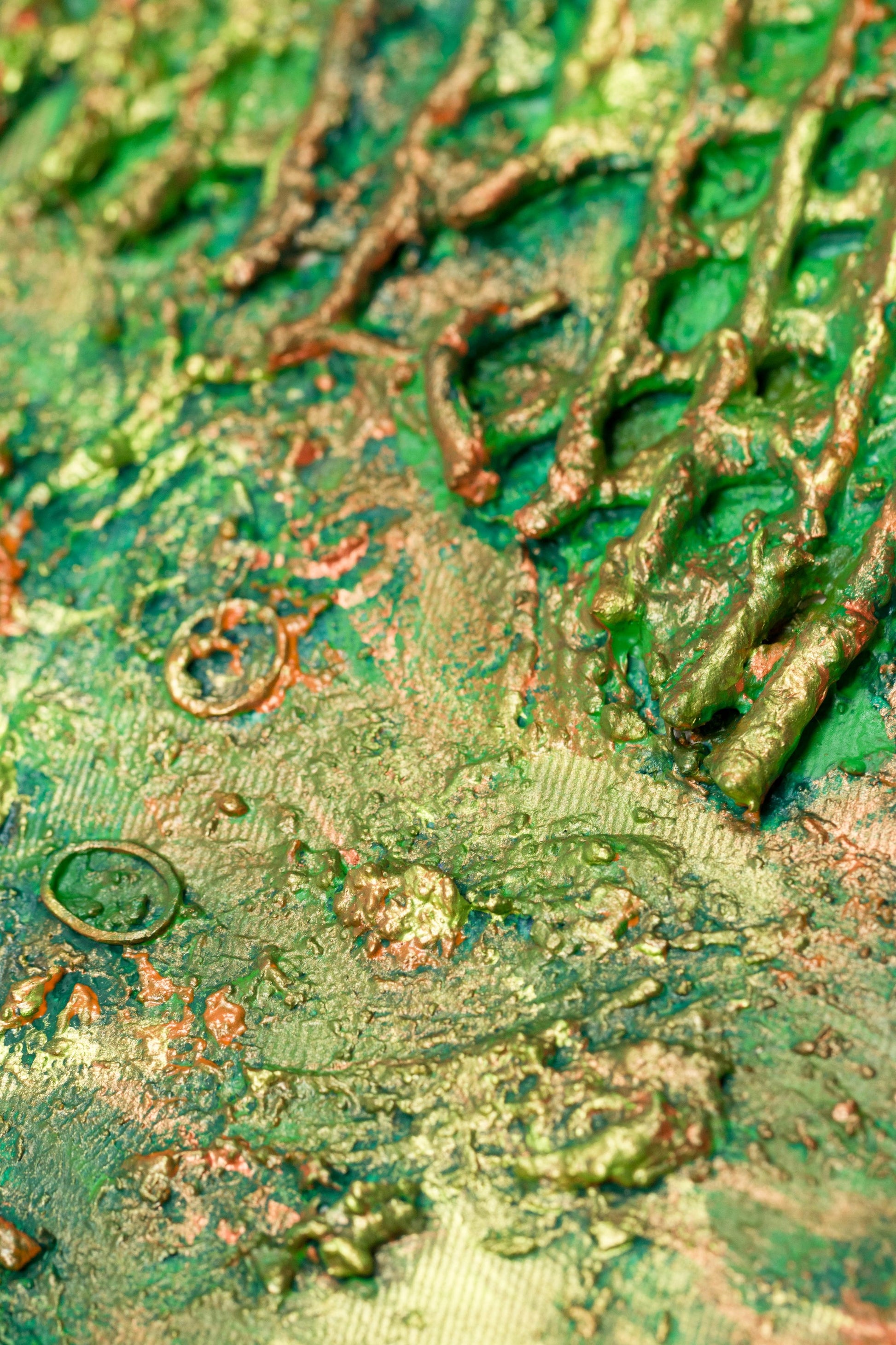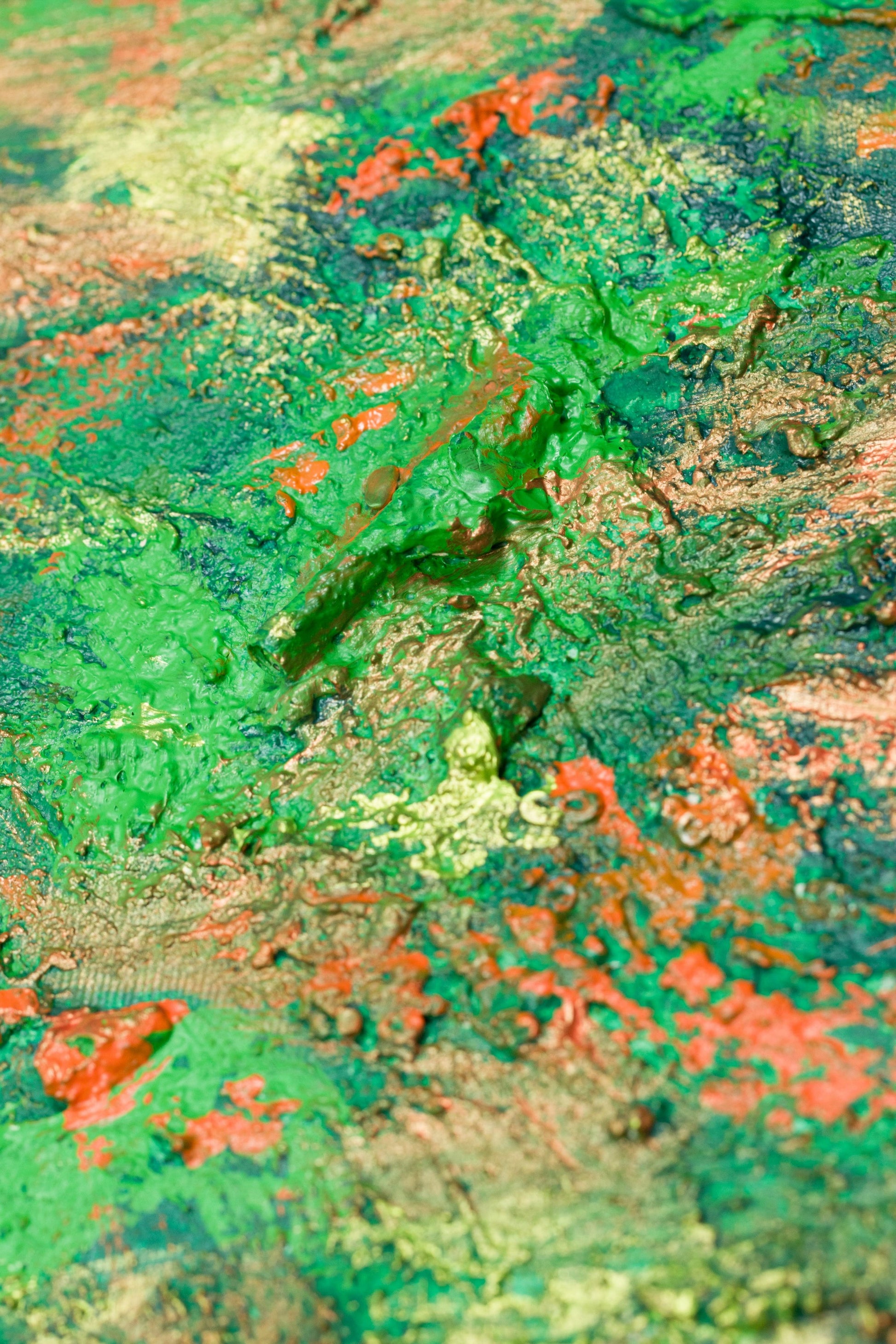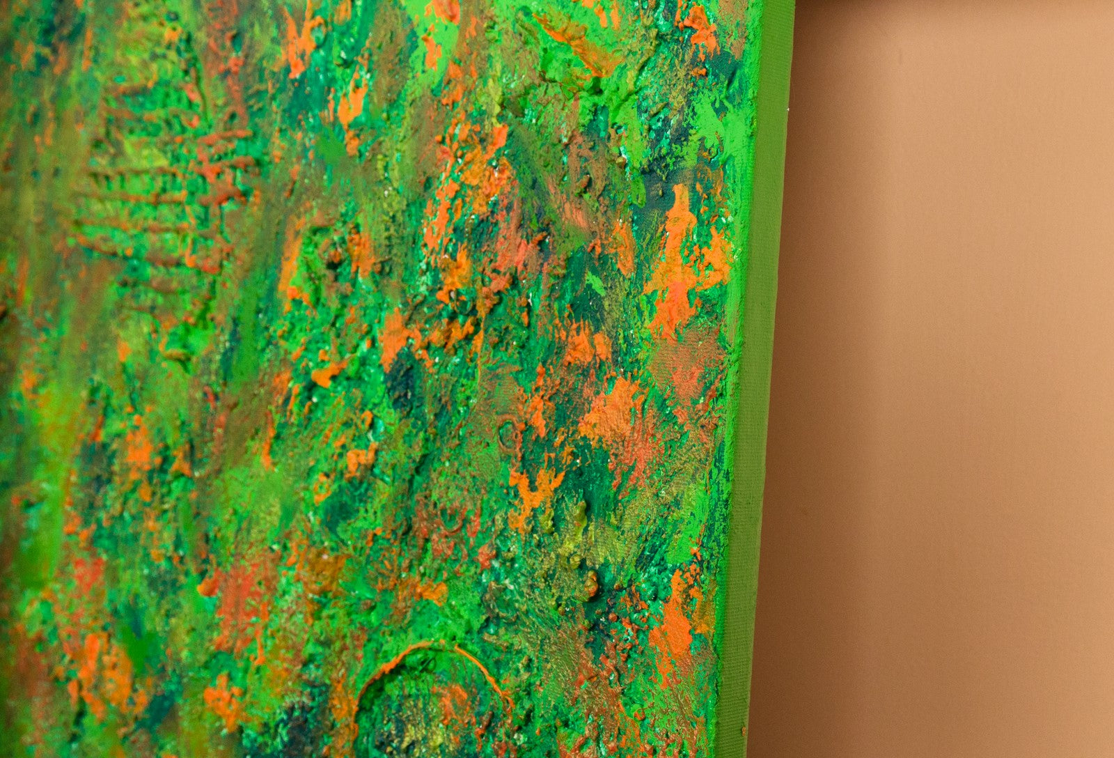 This is abstract painting on canvas. The style is defined by sculptural use of paint. It is 3-D, built-up mixture of many layers of thick gesso, paint, sand and other materials.