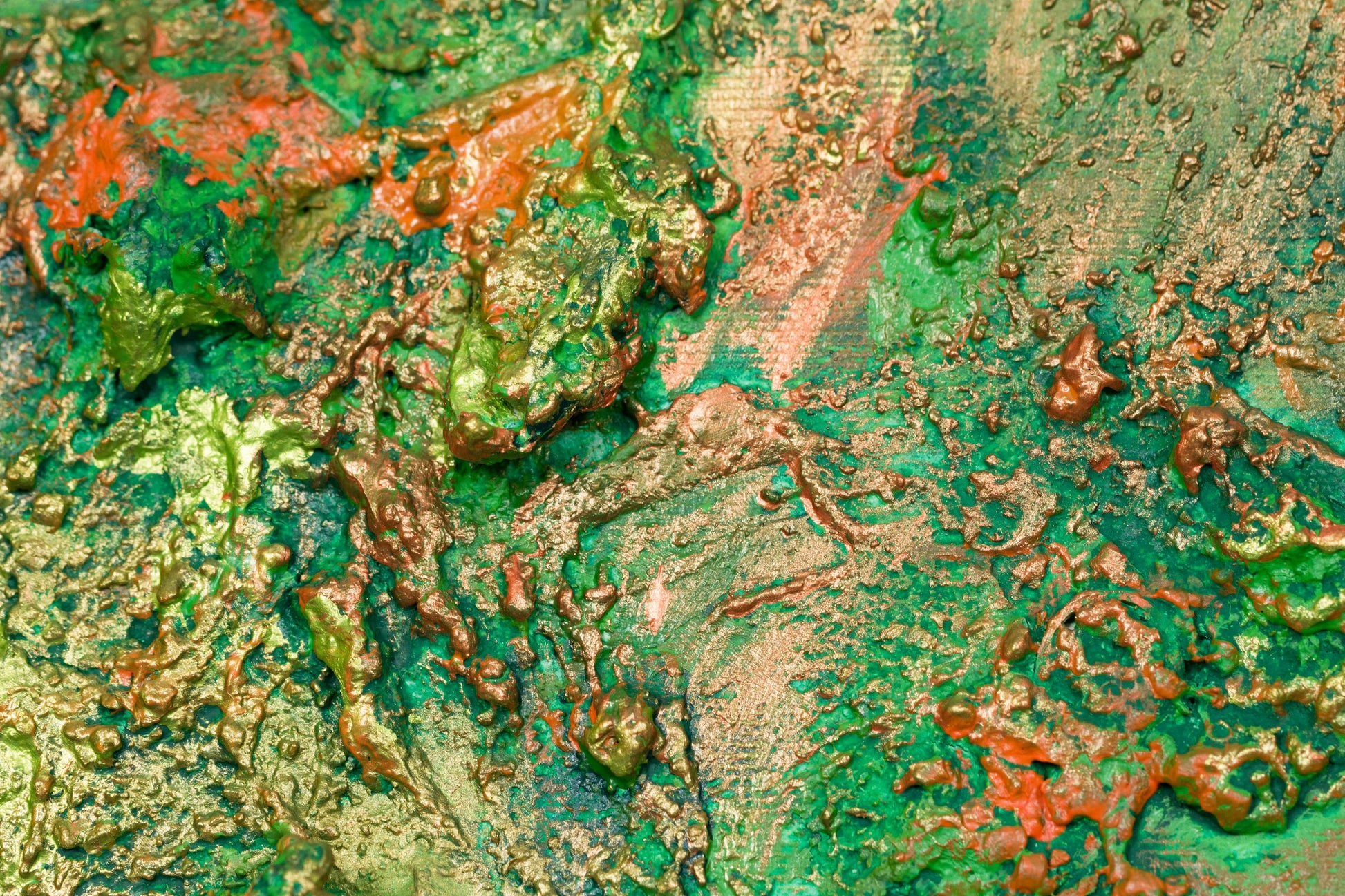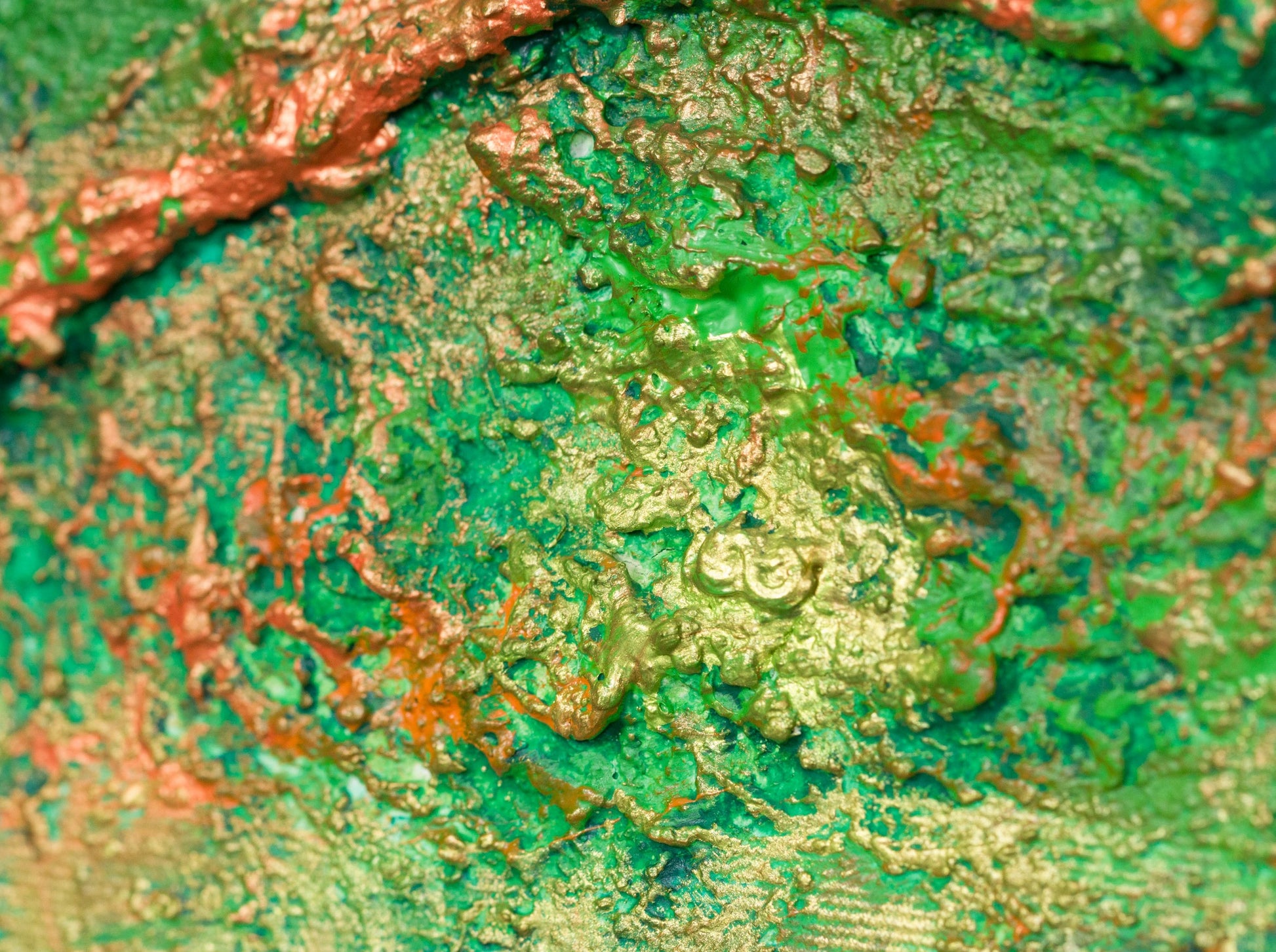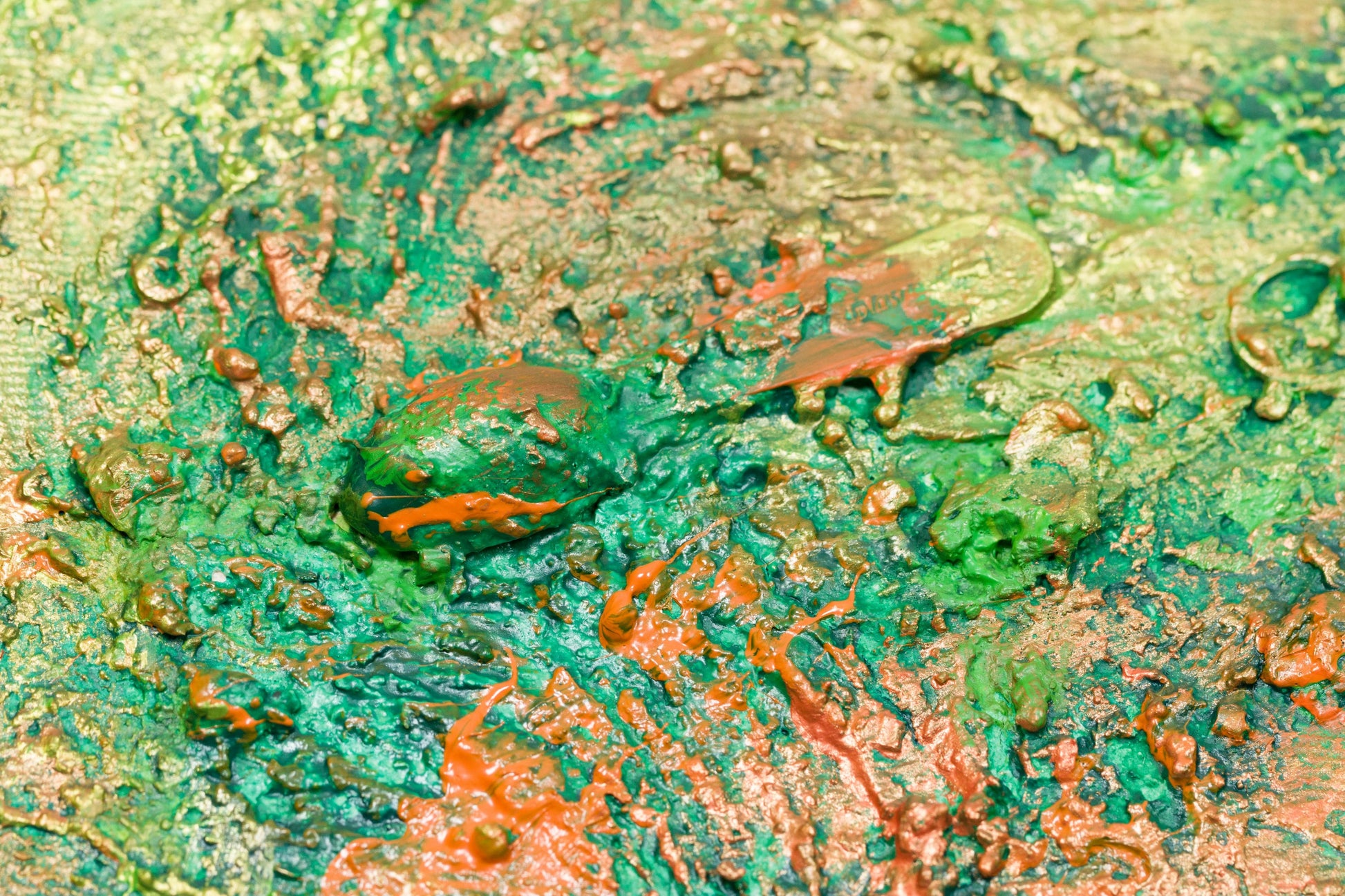 This is abstract painting on canvas. The style is defined by sculptural use of paint. It is 3-D, built-up mixture of many layers of thick gesso, paint, sand and other materials.