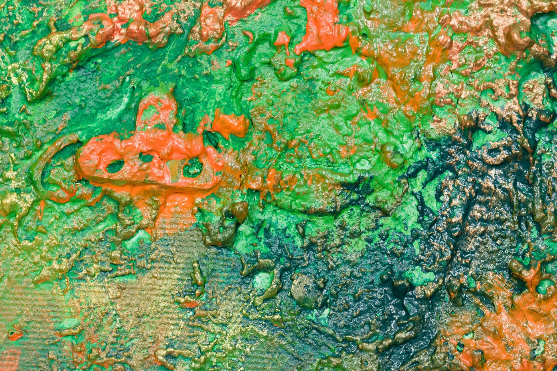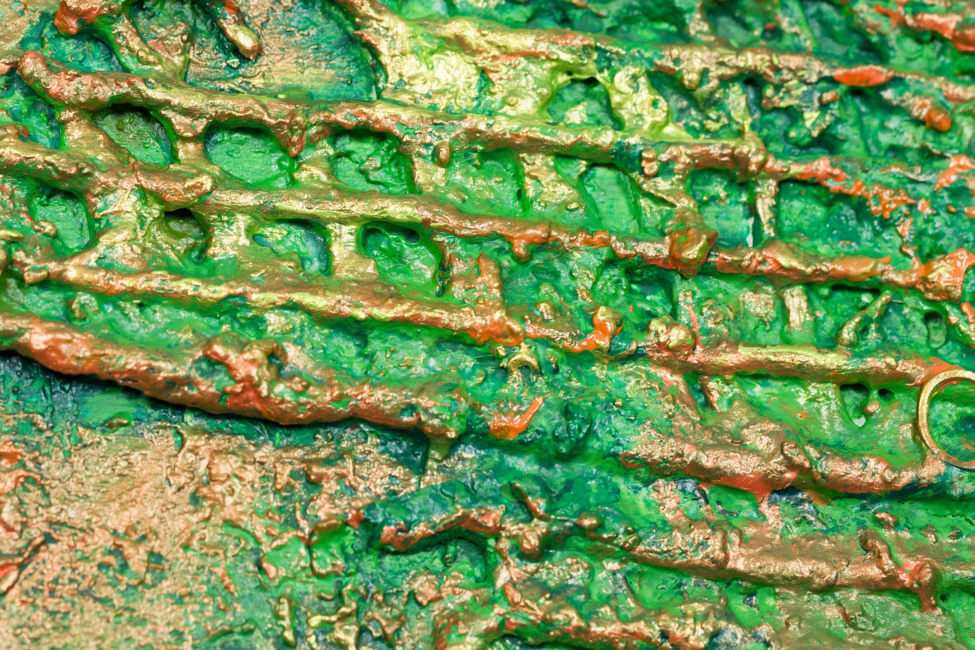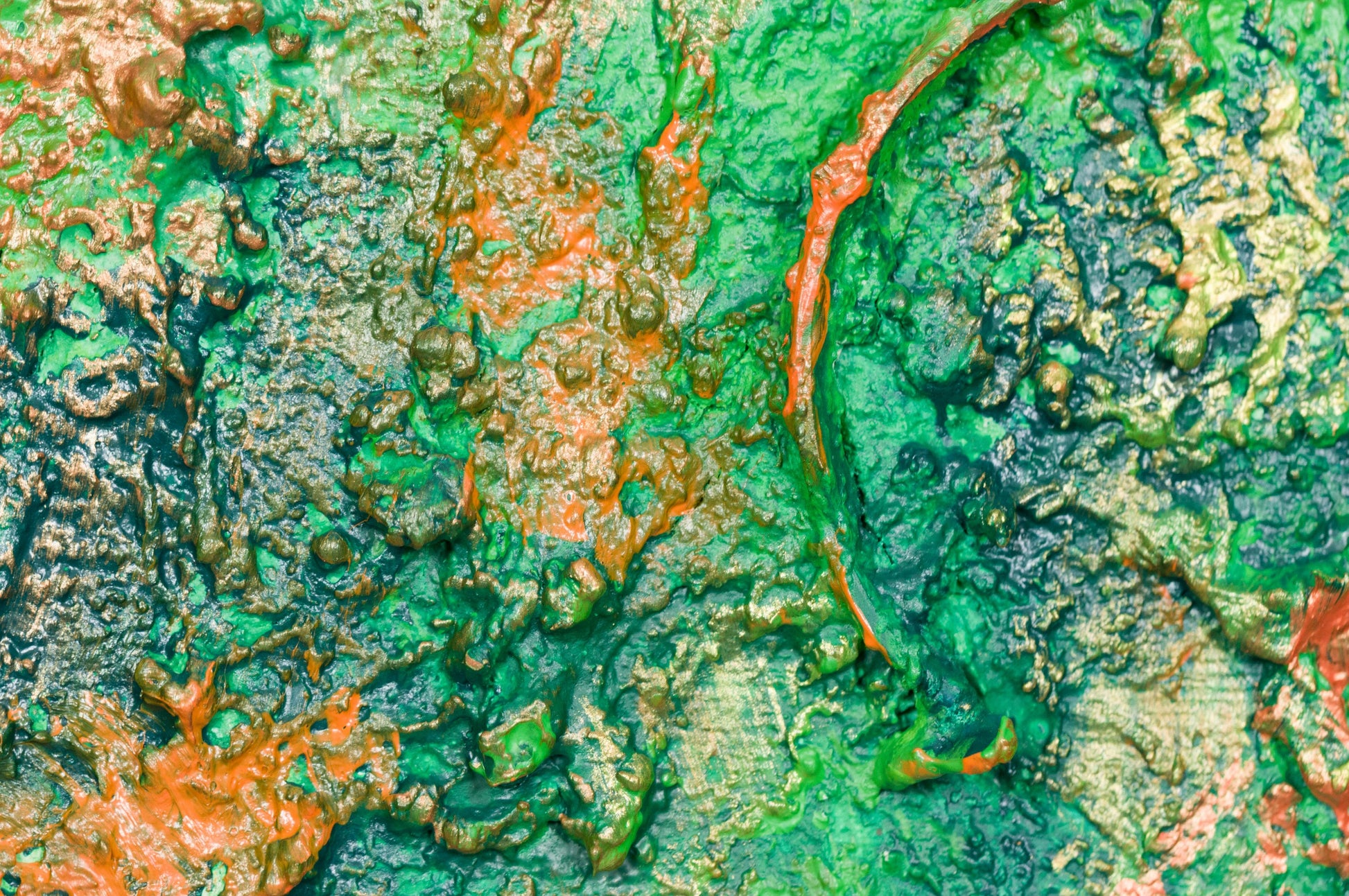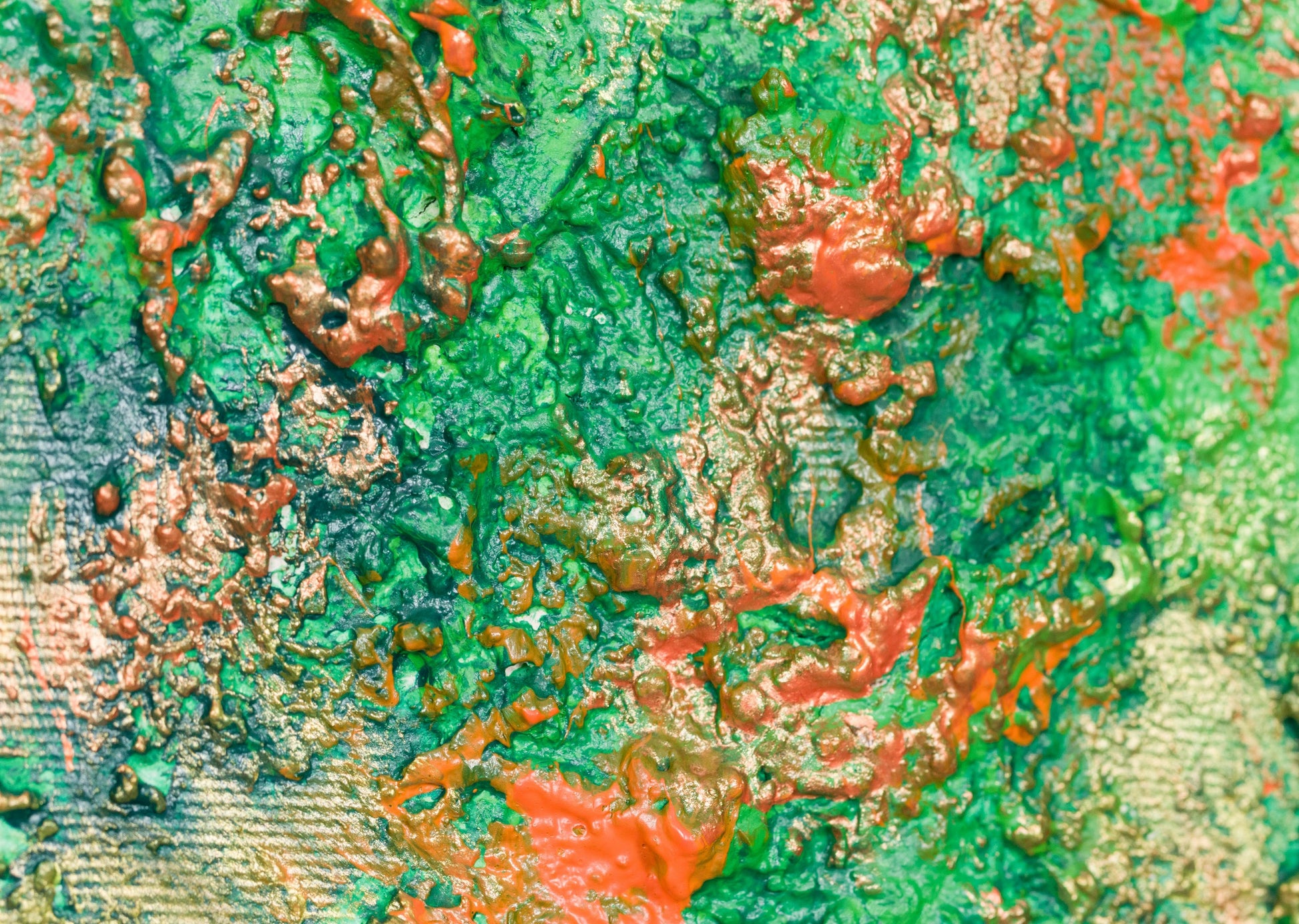 This is abstract painting on canvas. The style is defined by sculptural use of paint. It is 3-D, built-up mixture of many layers of thick gesso, paint, sand and other materials.