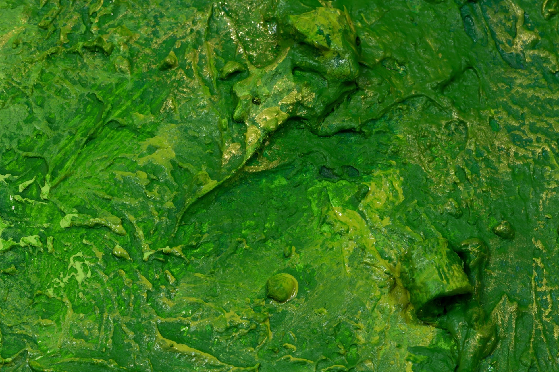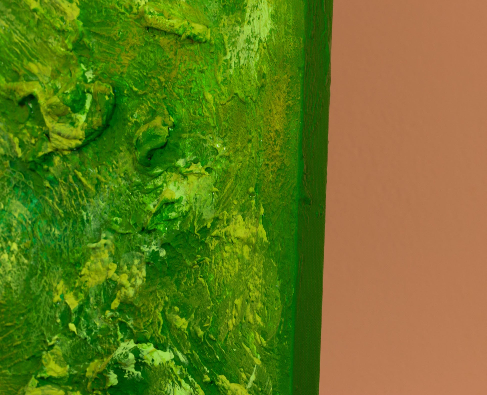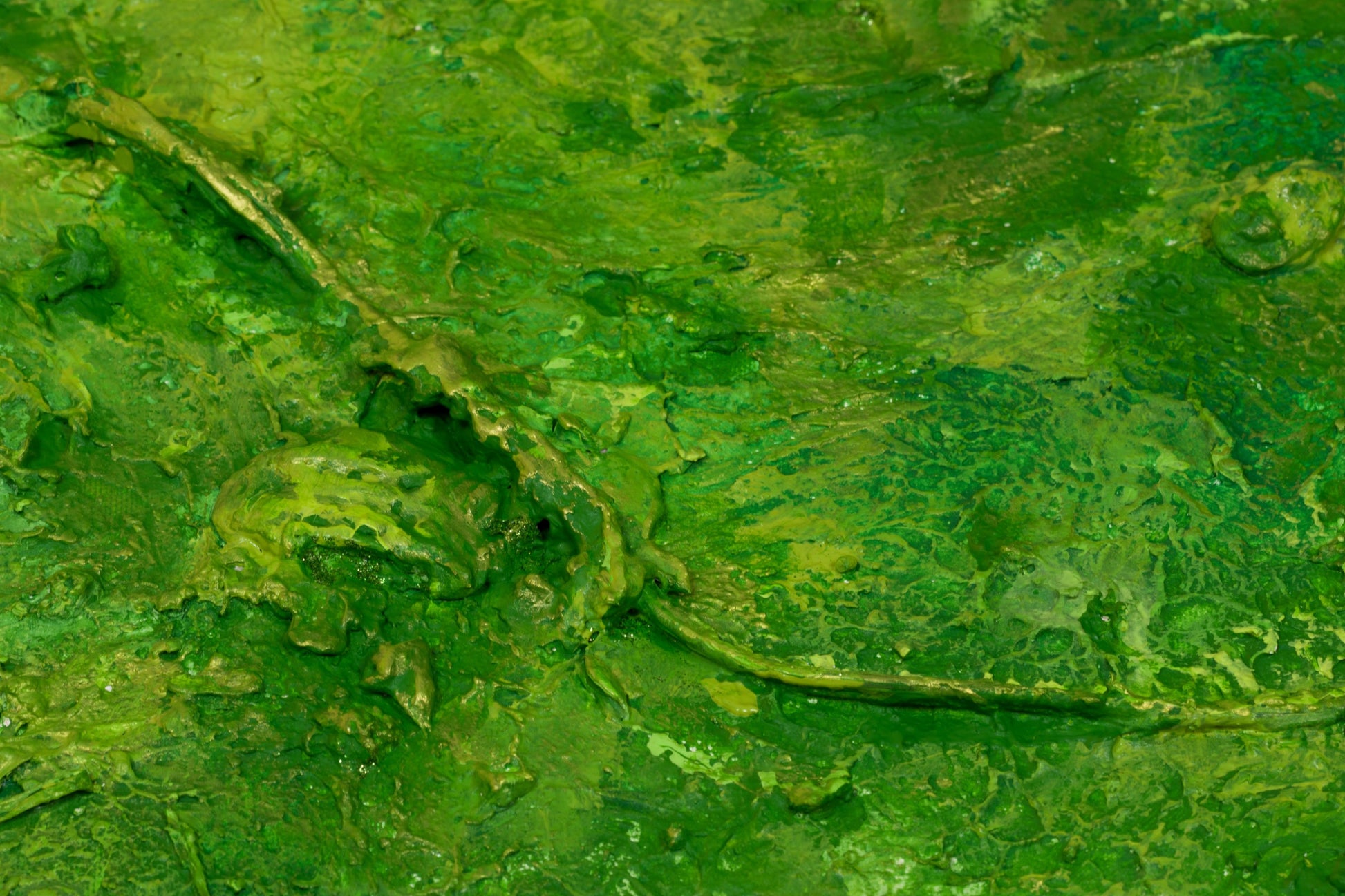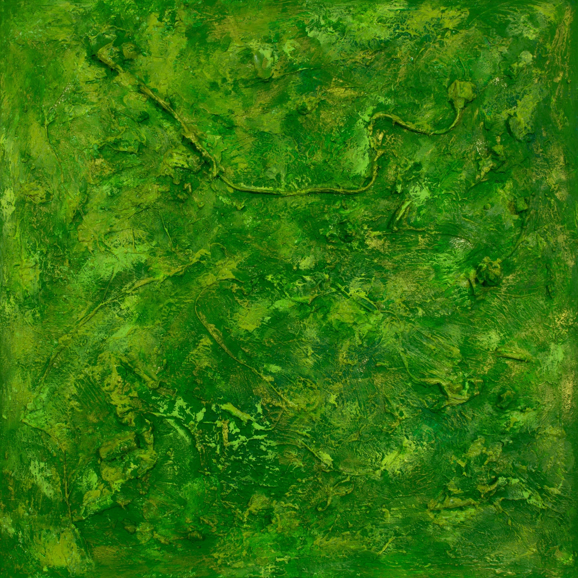 This is an abstract painting on canvas. The style is defined by sculptural use of paint. It is 3-D, built-up mixture of many layers of thick gesso, paint, sand and other materials.