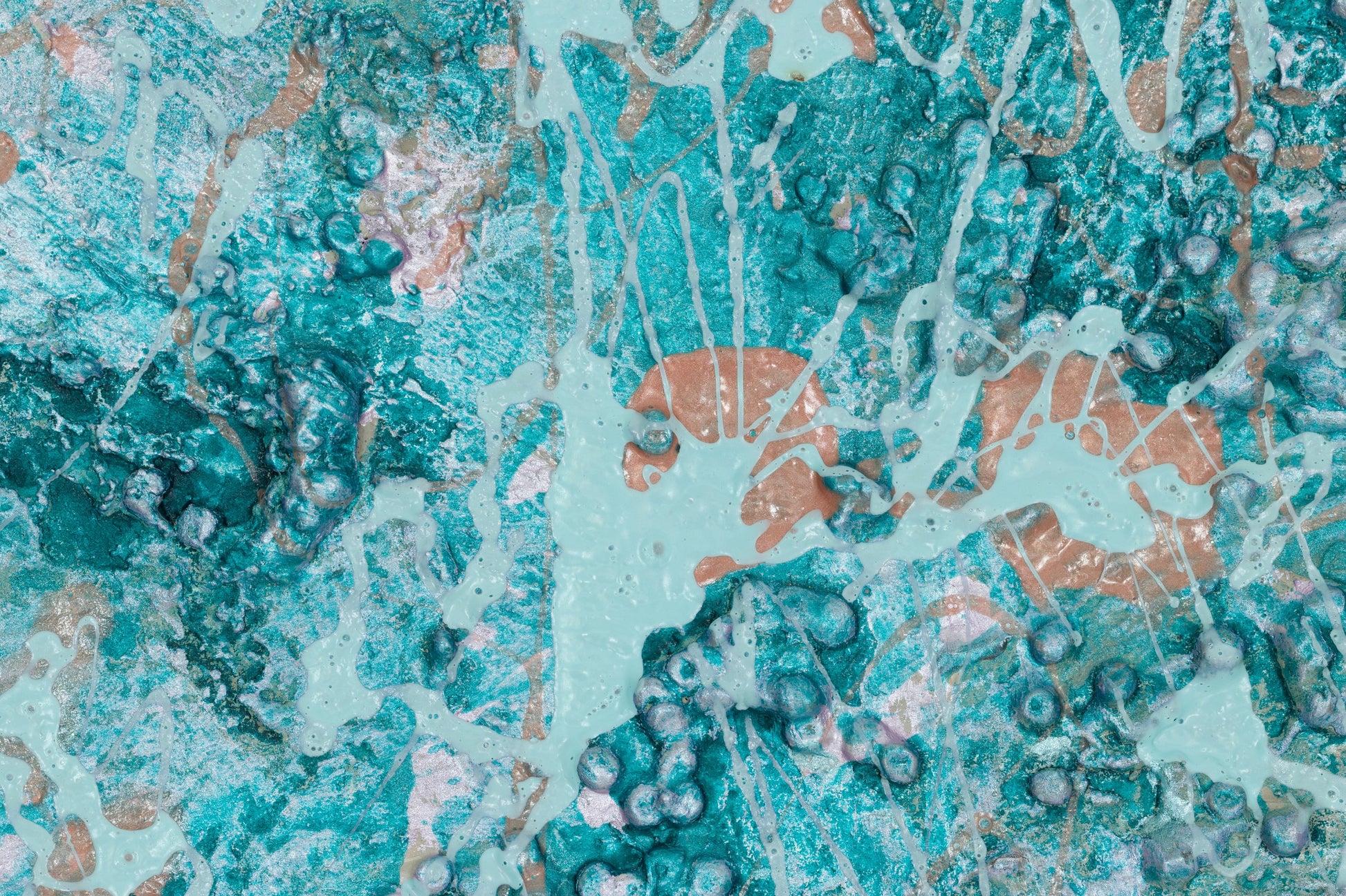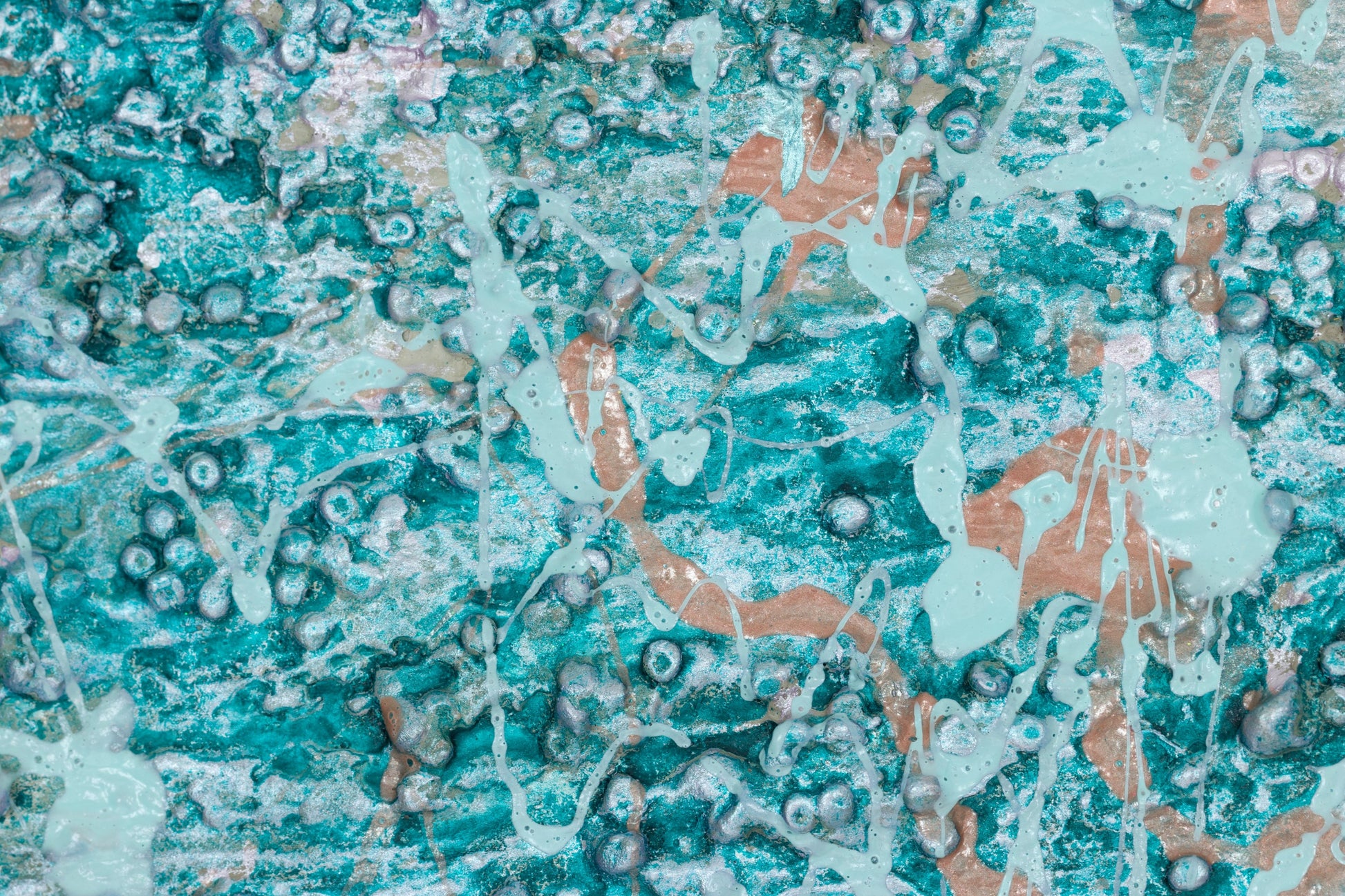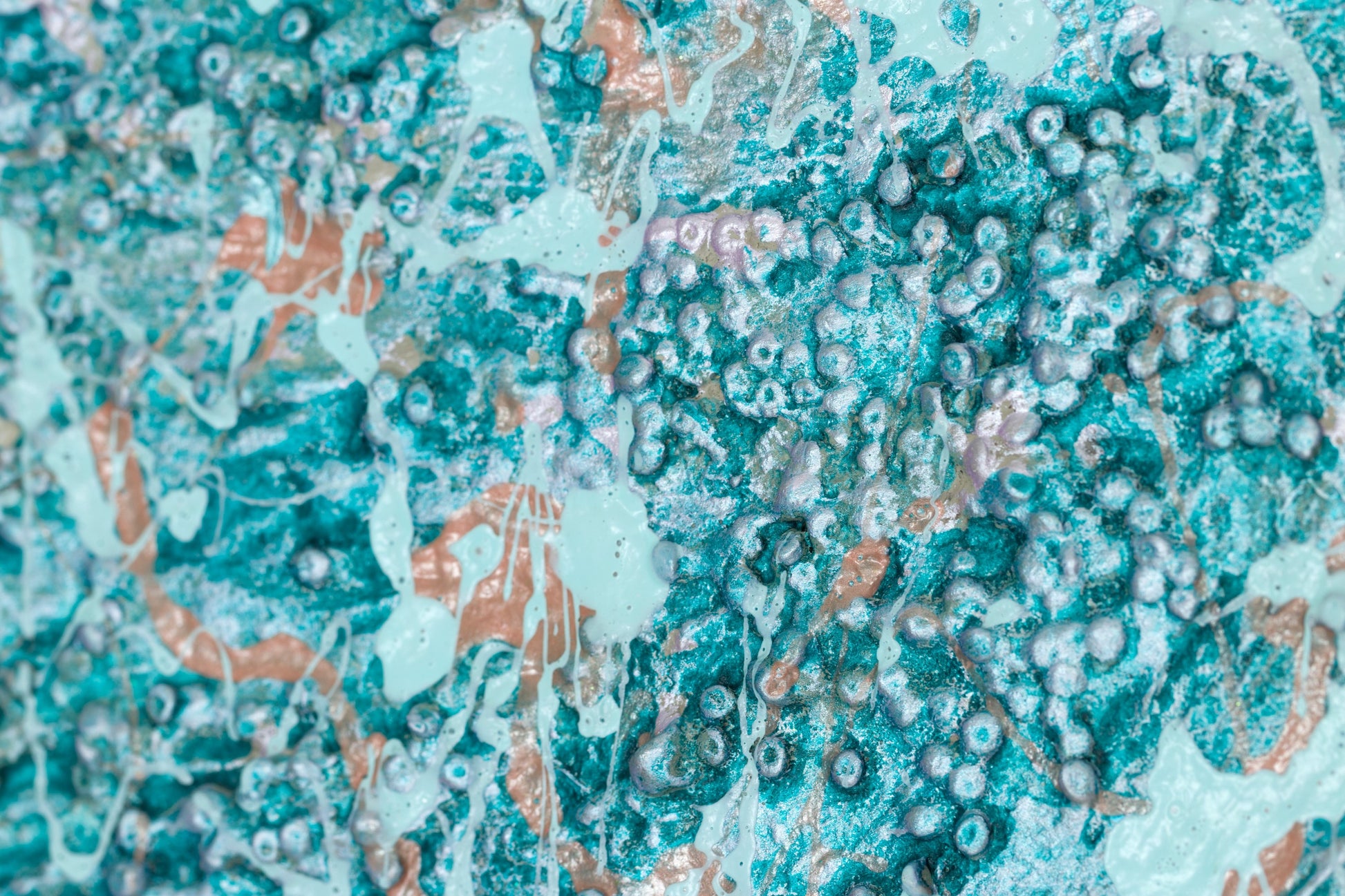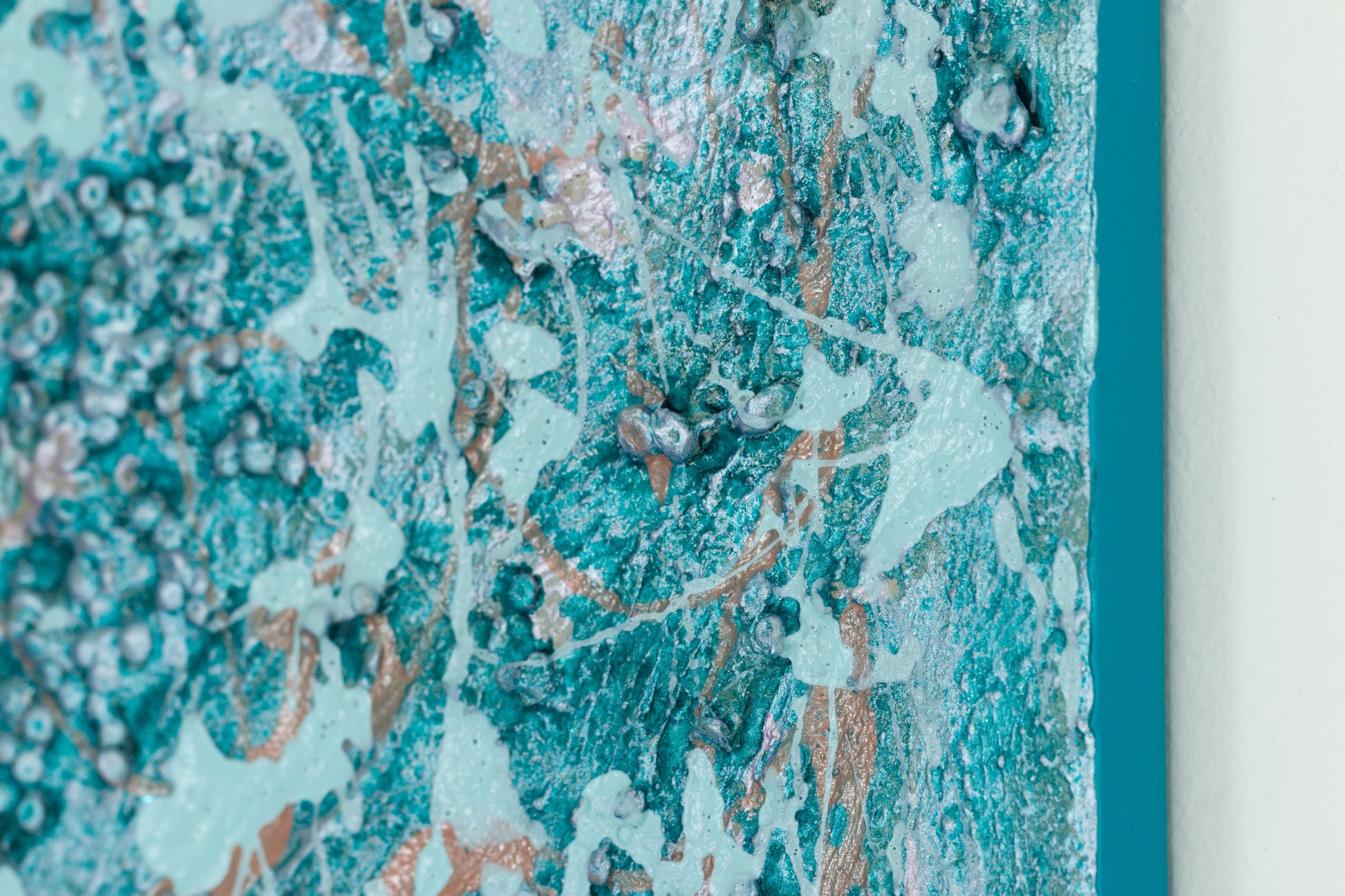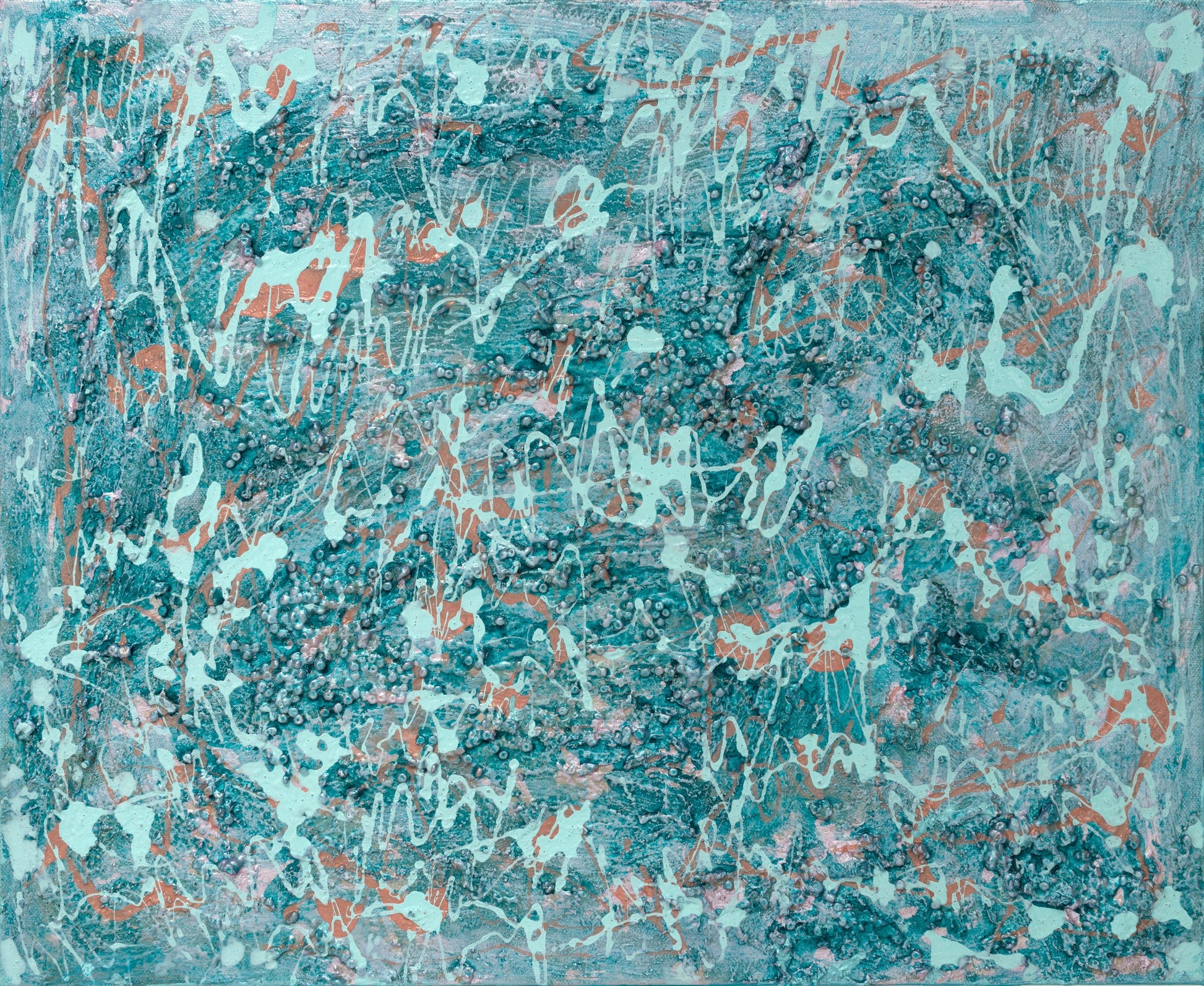 This is the original acrylic and objects painting on canvas that showcases a sculptural use of paint. The style creates a 3-D effect through a built-up mixture of thick gesso, paint, sand, and other materials.